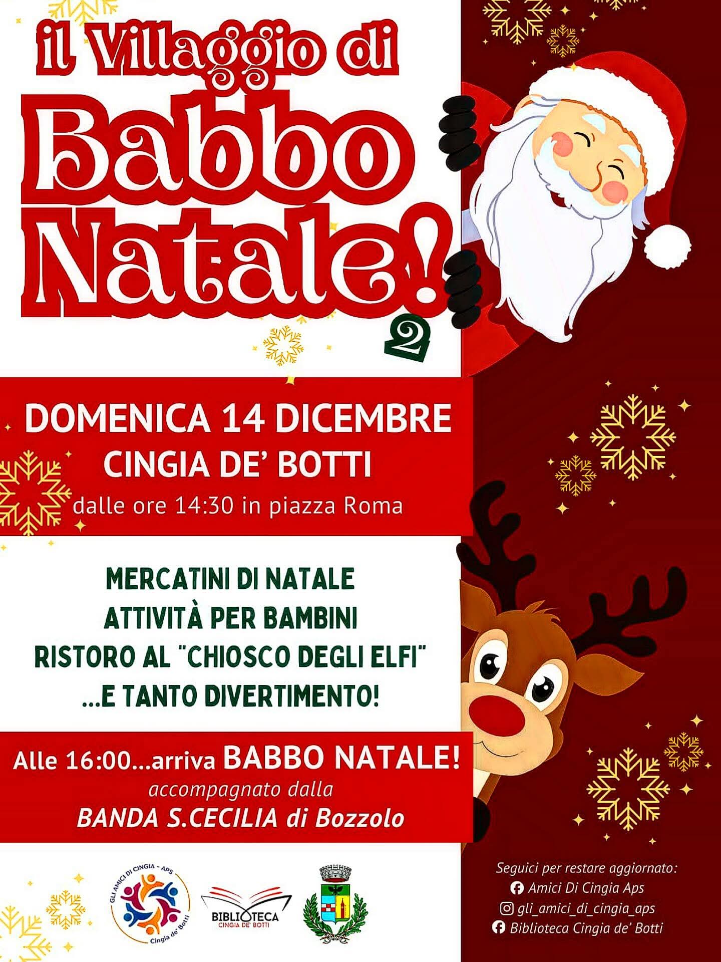 Il Comune di Cingia de’ Botti e la Biblioteca comunale invitano tutte le famiglie a partecipare al Villaggio di Babbo Natale, un pomeriggio dedicato alla magia del Natale - domenica 14.12.2025 P.za Roma dalle ore 14.30